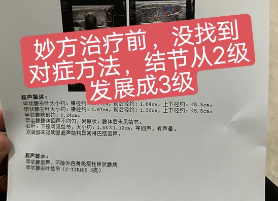 到21年年底检查的时候,又迎来了当头一棒,甲状腺结节由原来的多发0.3长大到1.5,结节性质也恶变成了3类。心里真的很慌,医生说还是继续观察,不明白观察的意义是什么。靠天靠地不如靠己,老公和家人都在着急的帮我想办法。